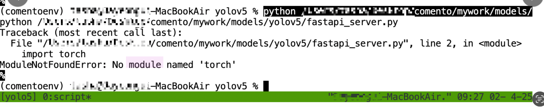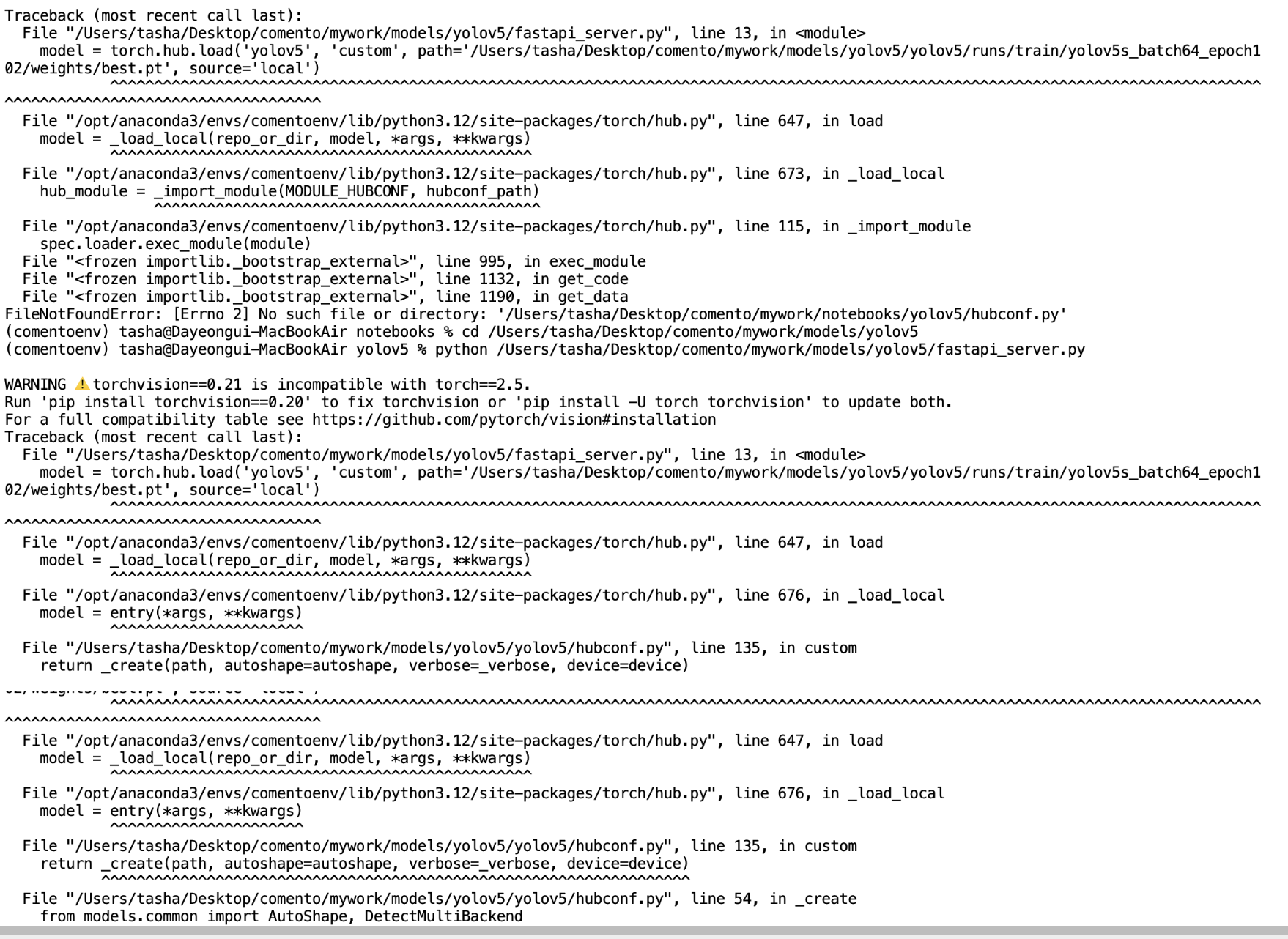 코멘토는 끝났지만,디벨롭 방향을 고민하다가 cctv 차량 객체 탐지를 위한 모델인데 임베디드를 위한 작업은 해본 적이 없어서 gpt의 추천과 함께 시도를 했다. 문제 1) 처음에는 GPT의 추천으로 동적 양자화를 시도했으나,계속 '모델'을 찾을 수 없다는 에러가 떴다. 모델 생성mport sysimport torch# yolov5의 경로를 sys.path에 추가sys.path.append('/Users/tasha/Desktop/comento/mywork/models/yolov5/yolov5/') # yolov5 디렉토리 경로# YOLOv5 모델 로드from models.experimental import attempt_load # YOLOv5 모델 로드 함수# 1. 학습한 모델 로드 (가중치 파일..