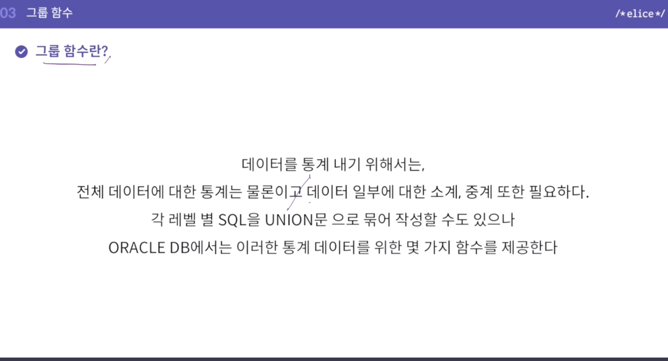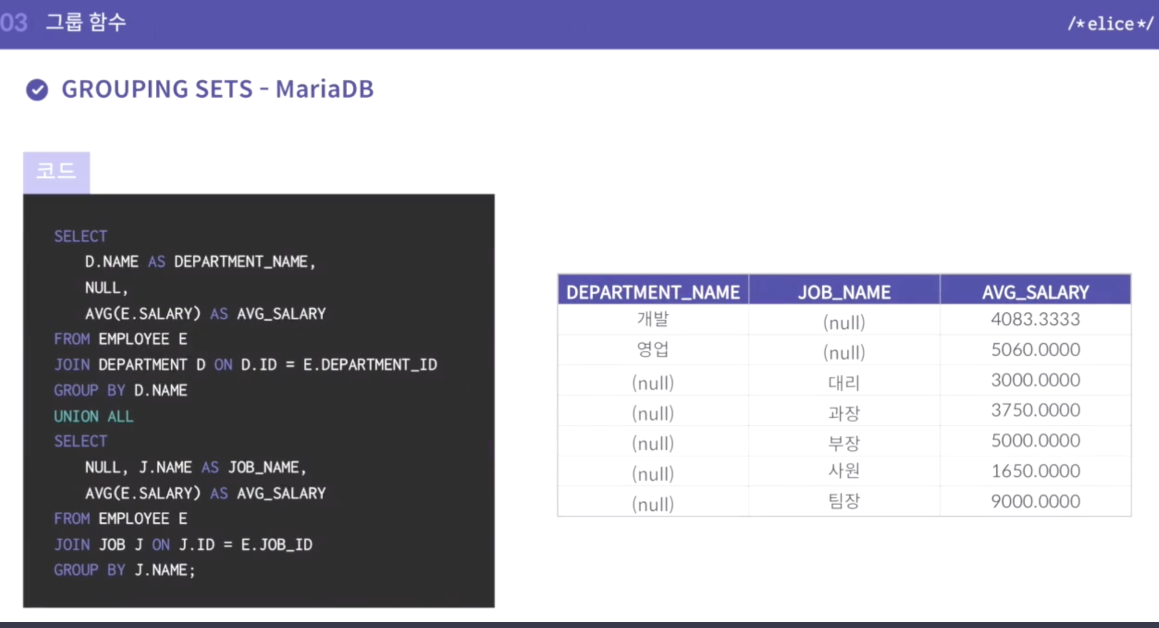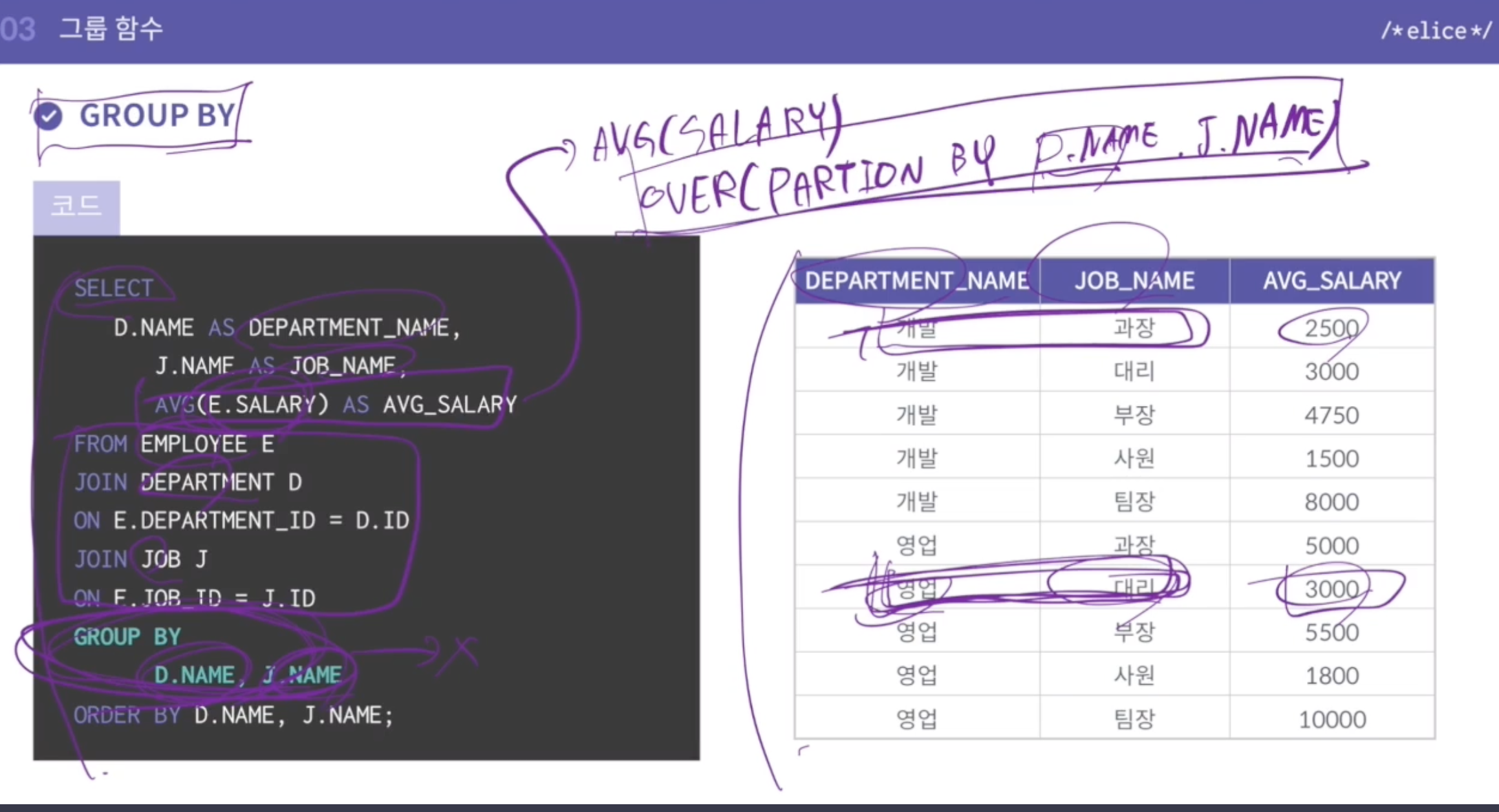 - 실무에서는 group by를 더 많이 사용한다고 함.