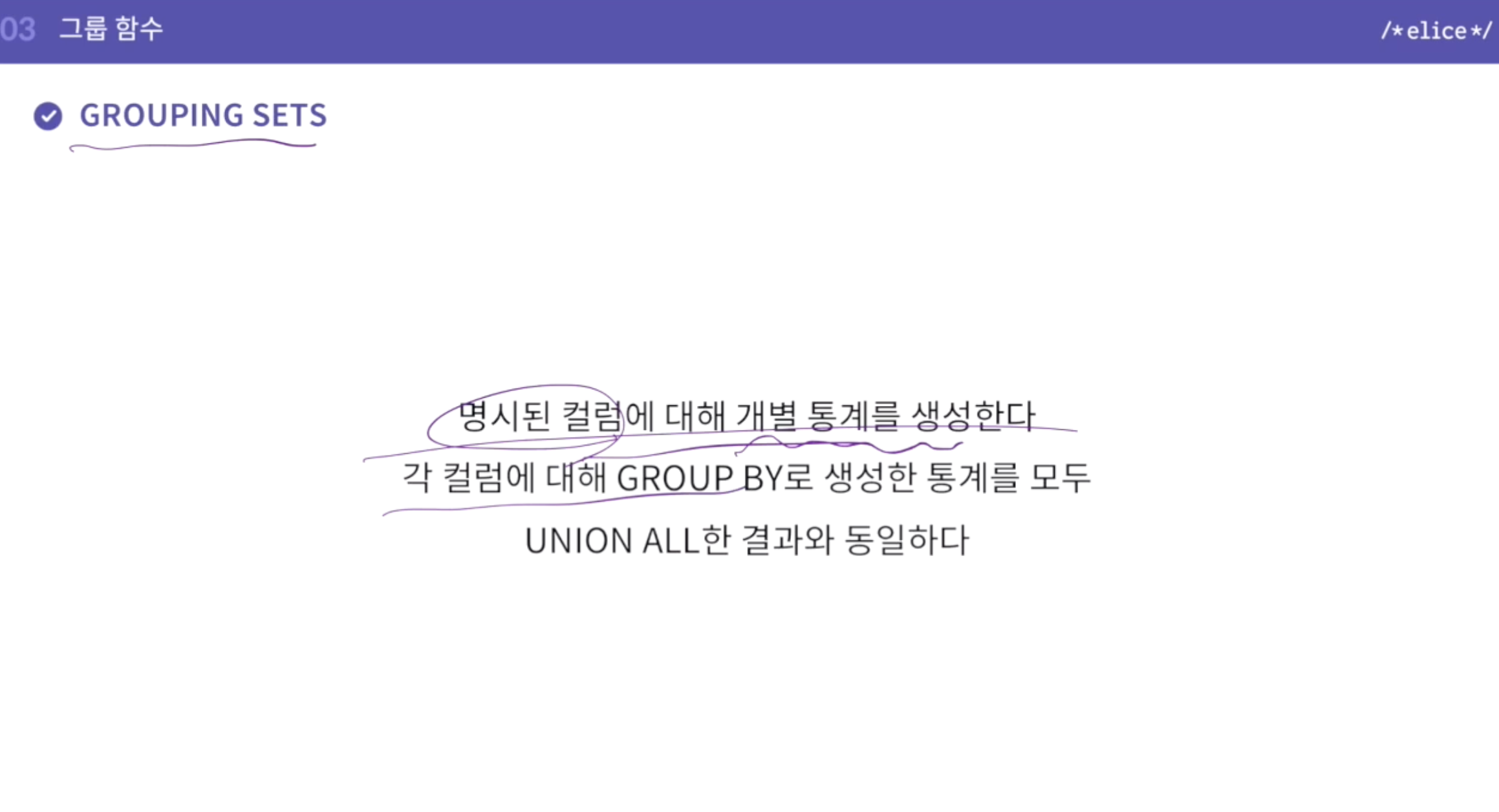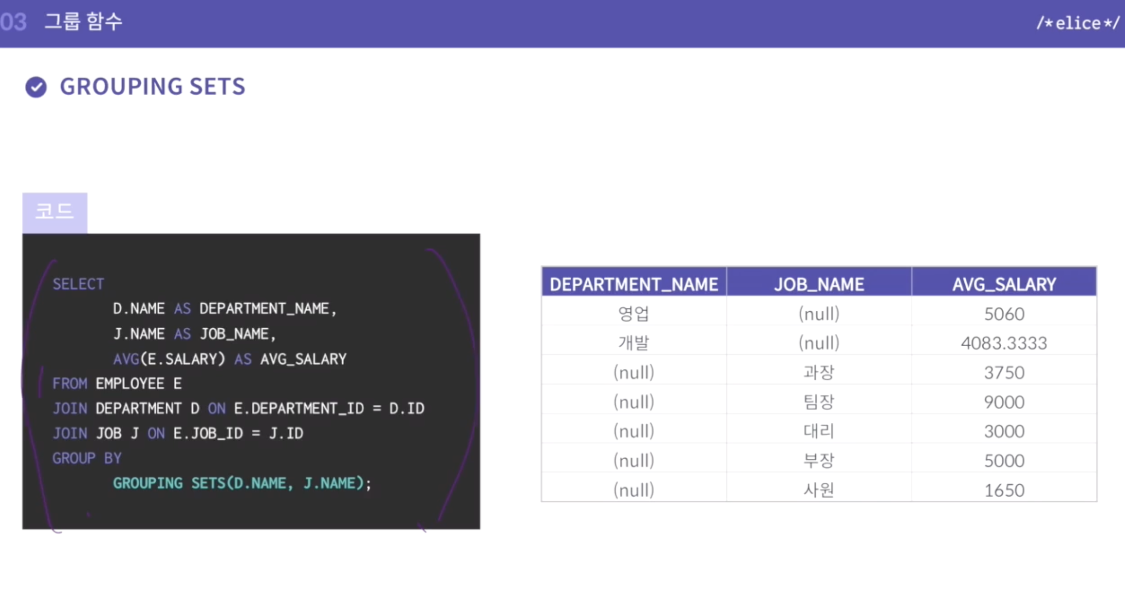 - ROLLUP처럼 동시에 고려하는게 아니라, grouping sets() 뒤에 칼럼 각각의 값을 그루핑