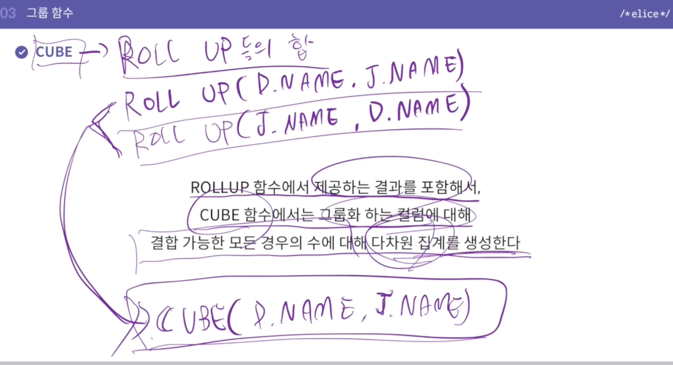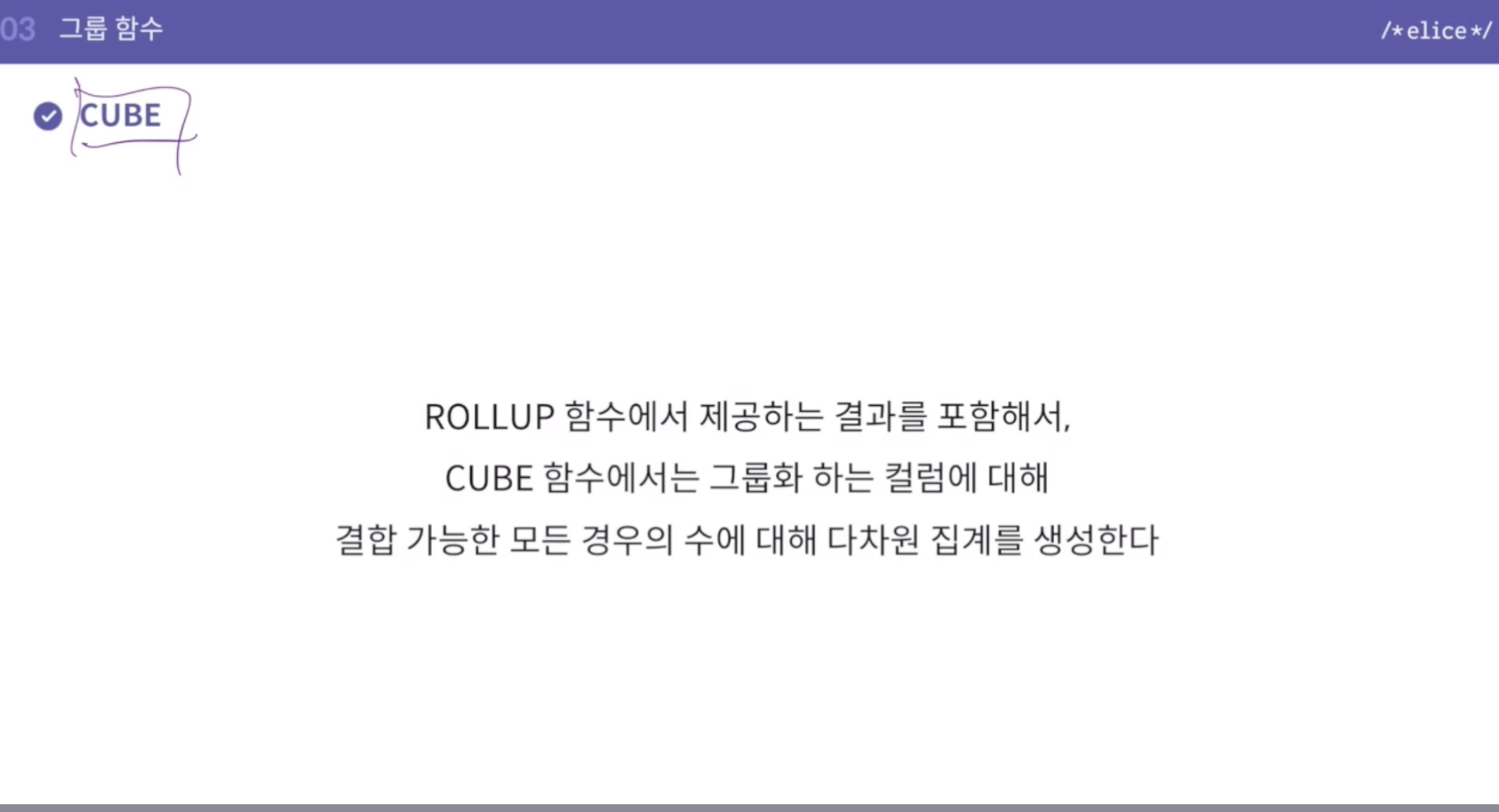 - so, rollup과 달리 cube는 뒤에 오는 칼럼의 순서가 상관이 없음.