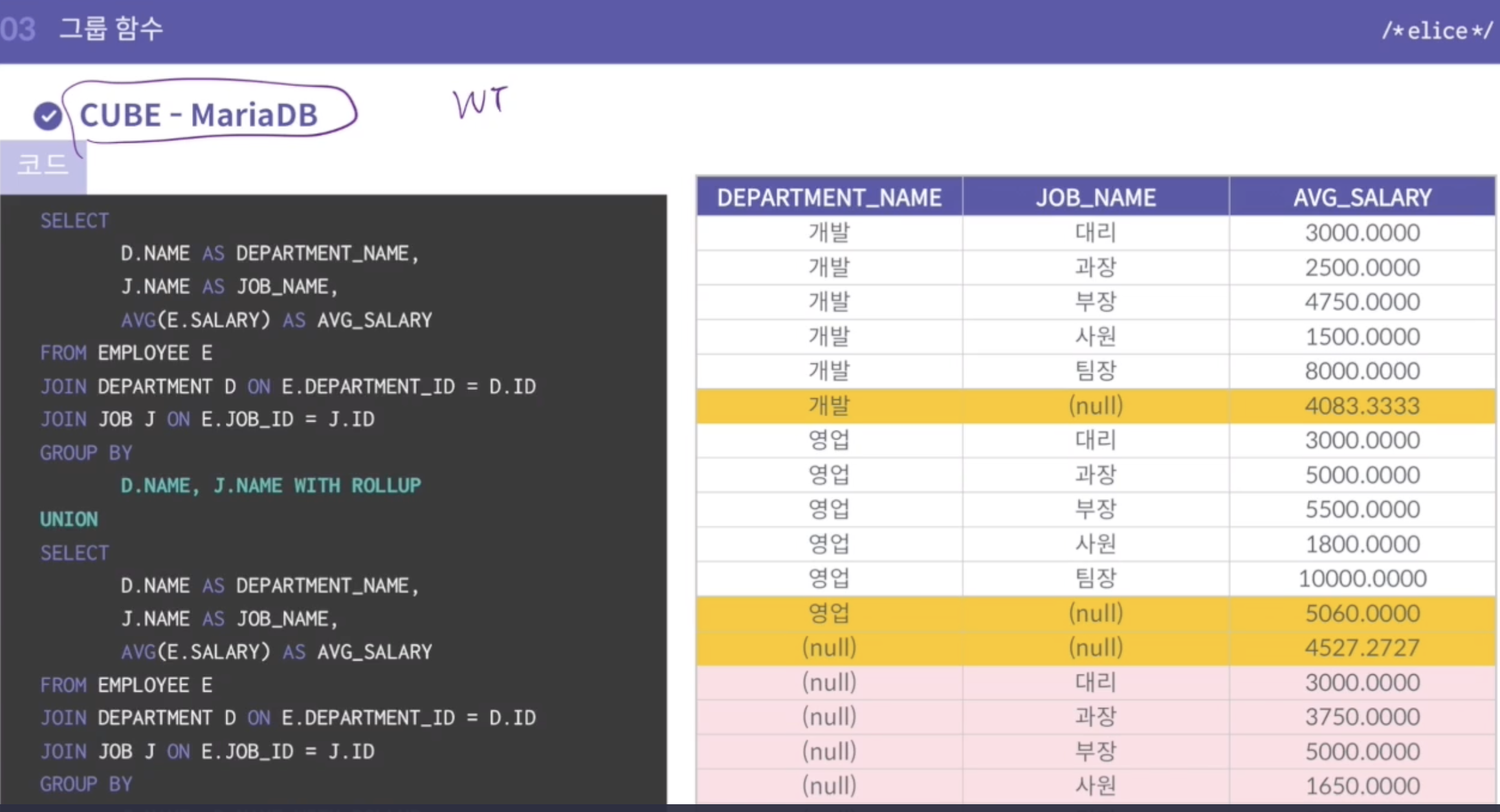 - 마리아 디비는 cube 가 없으니 with rollup 2개를 union 해주면 됨.