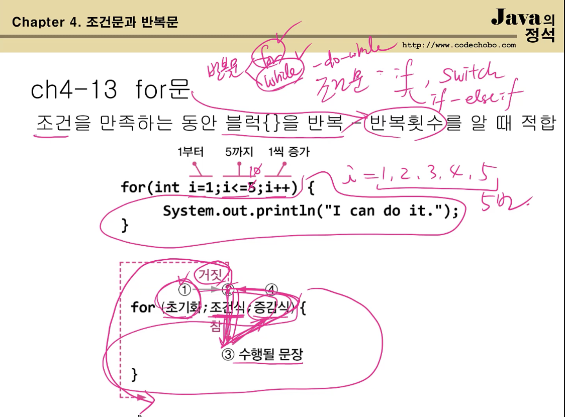 - 2배씩 증가하려면 i=i*2 => 즉, 원하는 조건식으로 아무거나 만들면 됨.