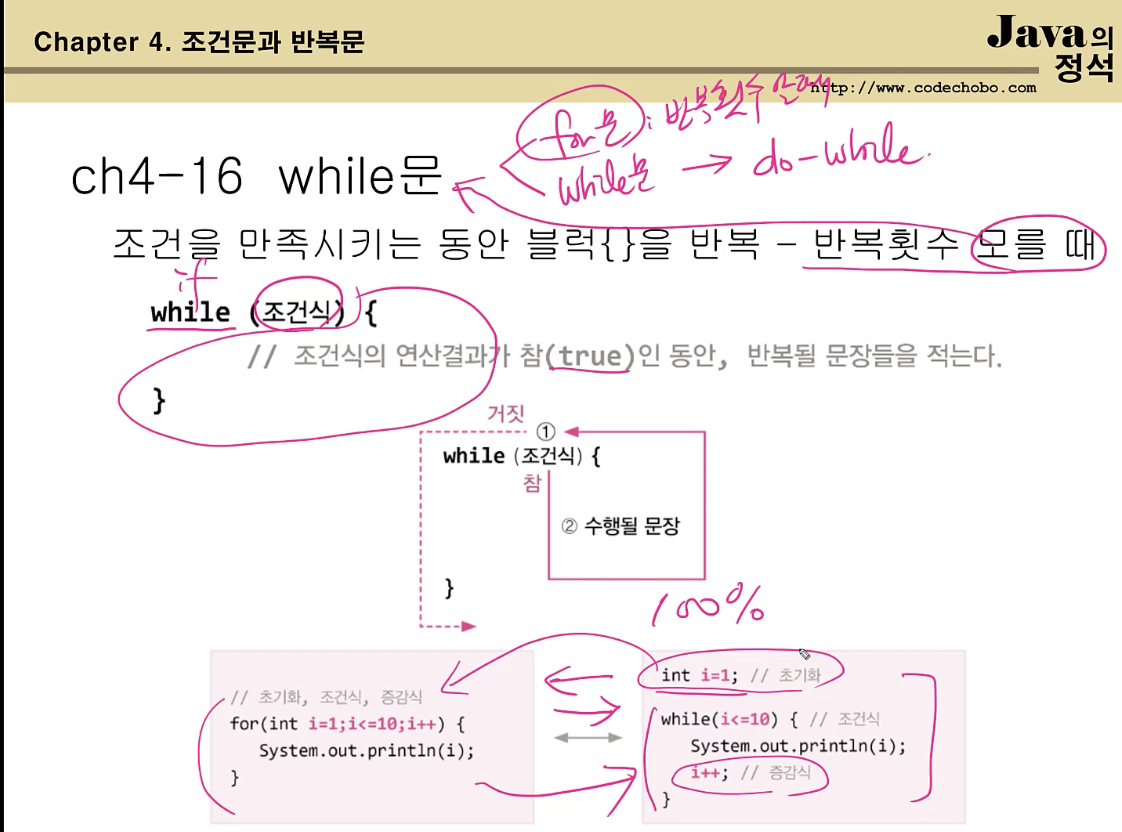 - while문은 조건식이 먼저하고 블럭인데 do-while문은 블럭(do)을 앞으로 뺀 것.