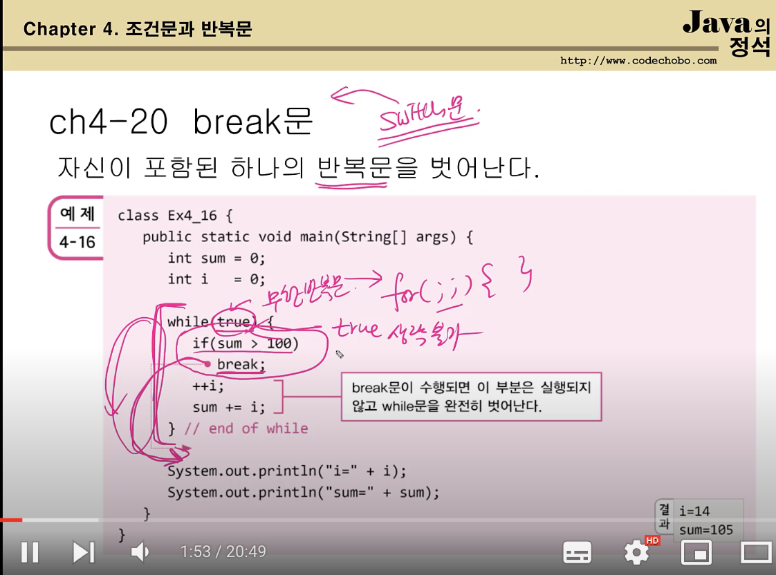 - 브레이크는 자신이 속한 하나의 반복문을 벗어남