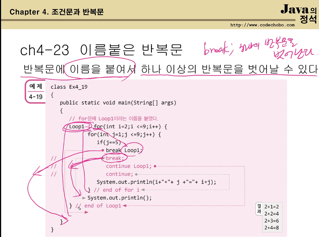 - 브레이크는 하나의 반복문만 벗어나기에, 반복문 앞에 이름을 붙여서 블레이크 뒤에 이름을 붙여줌.