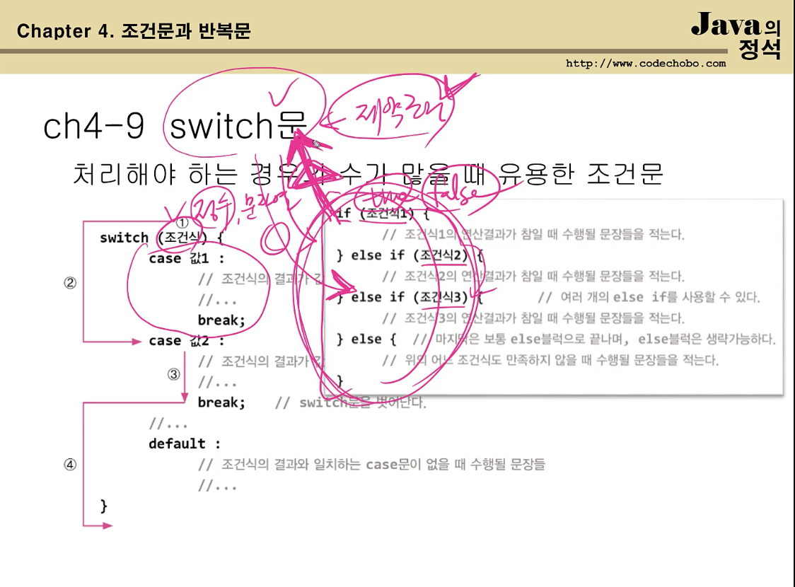 - switch문은 언제나 if else if문이 될 수 있지만, 반대는 항상 되는 게 아니기 때문에