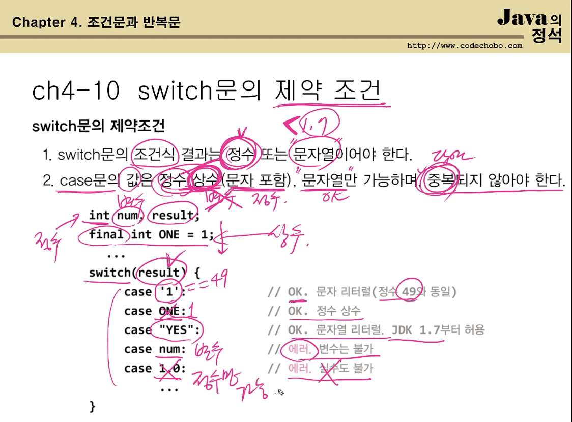 - 정수 또는 문자열만 되는데, 문자열은 JDK 1.7부터 되는 중.