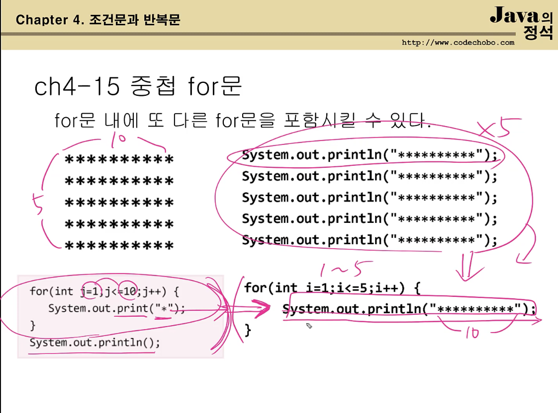 - 무식하게 다 찍어도 되는 데 for문을 중첩되게 할 수 있음.