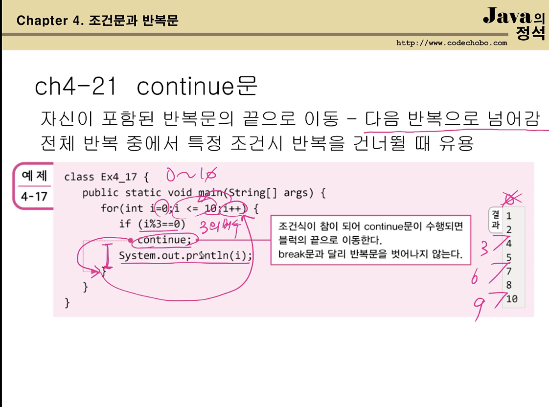 - 특정 조건을 만족하면 건너 뜀. 그래서 3의 배수는 출력을 건너뛰고 다시 조건식으로 돌아간 것임.