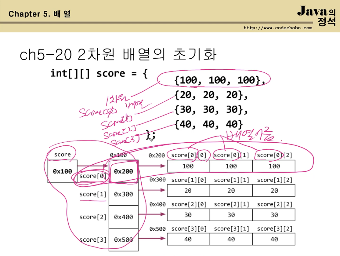 - 그래서 첫 줄은 score[0] 배열에서의 다시 0,1,2 각각에 값이 할당 되는 것