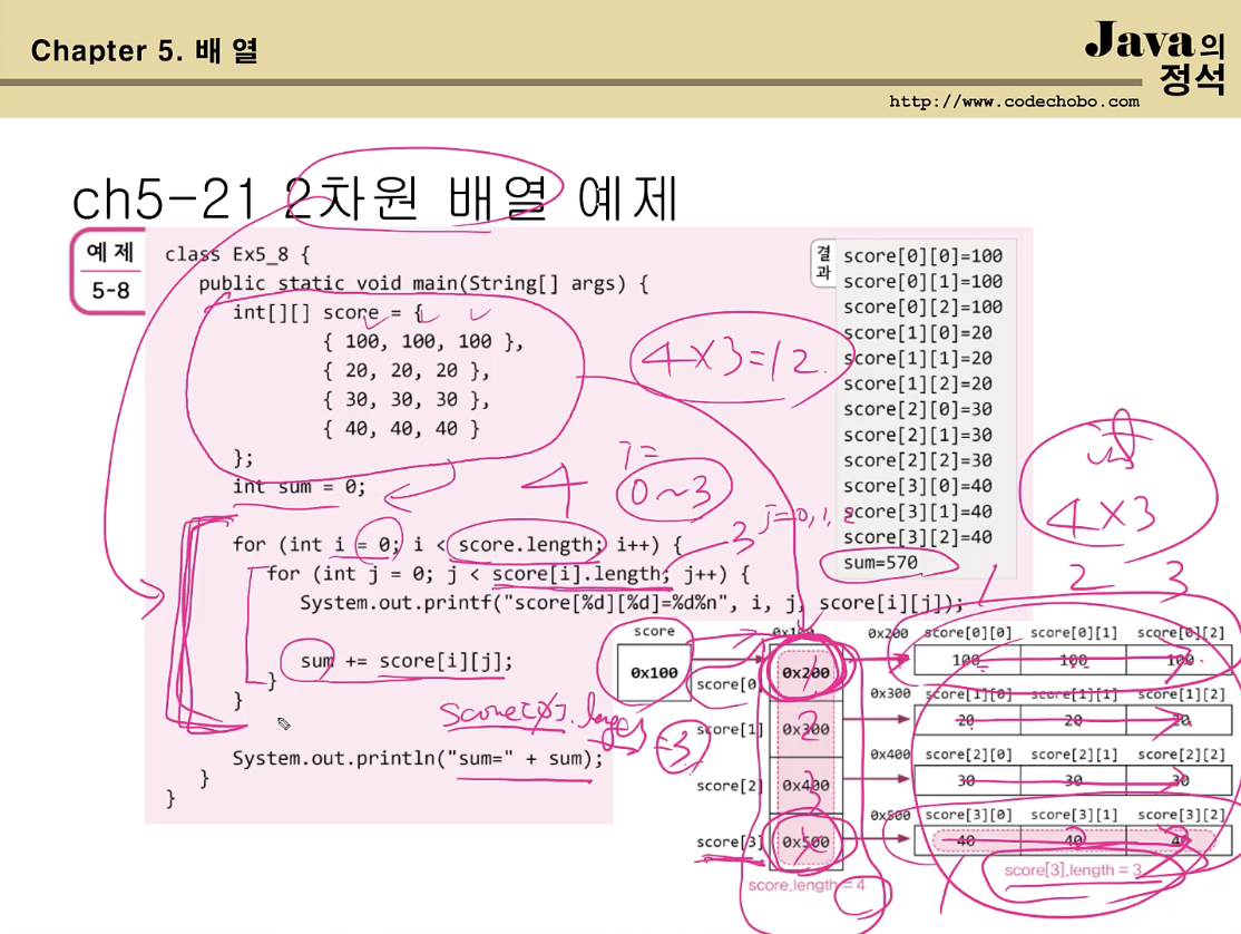 for (int j = 0; j < score[i].length; j++) { //열 ex. 3 열의 길이가 다 다를 수 있으니깐, i로 적어줌.