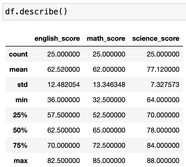 - .describe()를 쓰면 기초 통계 값을 확인할 수 있음.